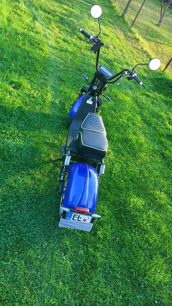 Skoro nejeto, garážováno, modrá metalíza s nadstandartním vybavením, max zatížení 160 kg, s vyndavací a uzamykatelnou baterií (20 Ah, 63V, rychlonabiječka s chlazením na 230V), max rychlost 45 km/h, dojezd 53 km, celoodpružená. Koupeno v kamenné prodejně, chopper je přihlášen na registrační značce. Pořízeno 05/2022. STK platné do 05/2028.