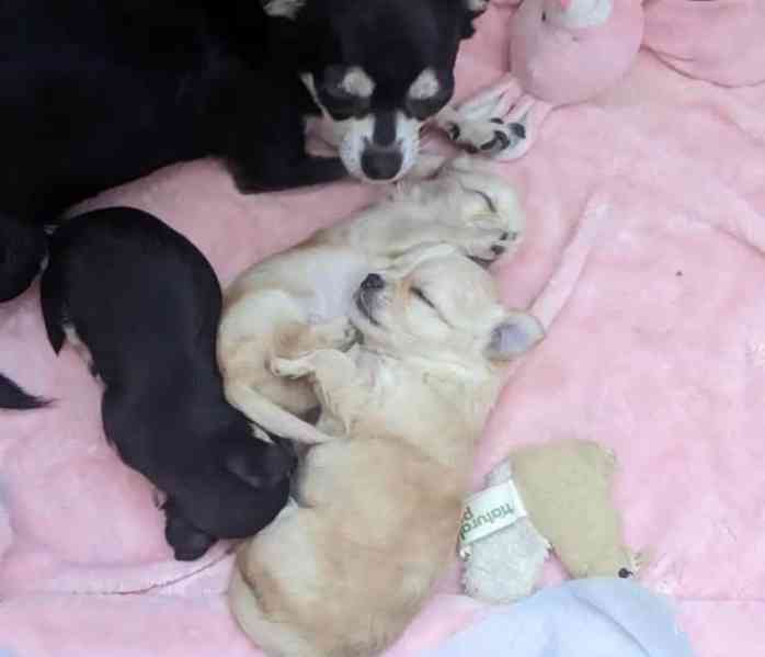 Čivava, chihuahua. Zadáme krásná štěňátka čivavy, krátko i dlouhosrstá, s průkazem původu. Zdraví (o. pately 0/0, oči i srdce OK), ocenění rodiče. Štěňátka socializována, učena čistotě. Při odběru budou opakovaně odčervena, očkována, čipována, se smlouvou, balíčkem a s krmením, na které jsou zvyklá. Těší se na milující páníčky. Chovatelský servis pro majitele.