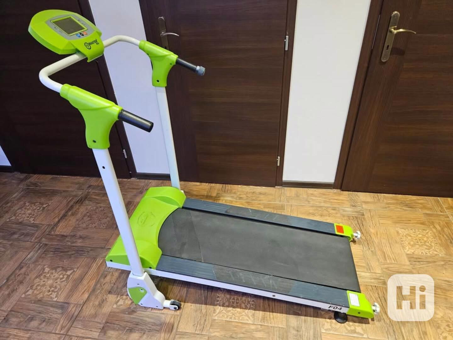 Běžecký pás Master F-04 (MAS-F04). Použitý, ve výborném stavu, seřízený a zkontrolovaný technikem. Je skladný, dá se složit, zajistit šroubem a postavit ke stěně. Na pojíždění má kolečka.